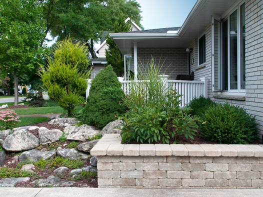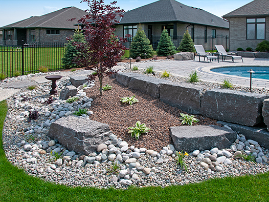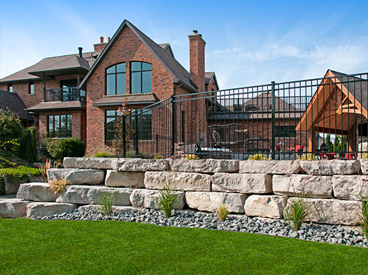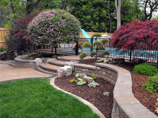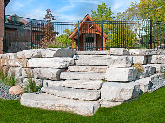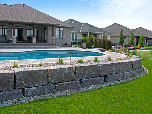 Retaining walls are used to level out sloped areas and to create multi-levels of interest and aesthetic appeal. Material choices are natural stone, including small drywall to large armour stone, and precast concrete available in many styles and colors, and is by far the most common retaining wall choice.